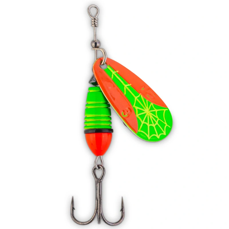 Crack Blade Spinner je postavený na mosazném těle a mosazném rotačním listu, což přináší výborné letové vlastnosti a přesné nahození. Při vedení vytváří výraznou tlakovou vlnu a současně vrací odlesky z různých úhlů, takže zůstává dobře čitelný i v proměnlivém světle. Rotační list se rozbíhá už při minimálním tahu, a třpytka je proto účinná i při pomalém vedení. O spolehlivé zaseknutí se stará extrémně ostrý trojháček Kona a kontrastní UV aktivní dekor dodává nástraze další vizuální impuls.