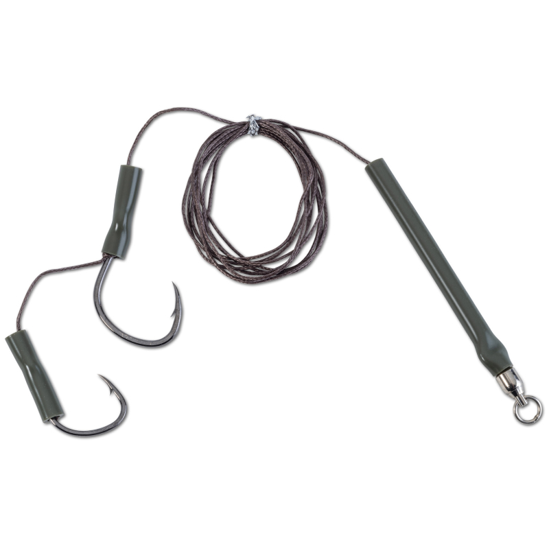 Tento ručně vázaný návazec je ideální pro lov sumců s živými nebo mrtvými nástražními rybkami, rousnicemi či kousky kalamárů. Použité jednoháčky SX-67 Kona ve velikostech 4/0 + 2/0 zajišťují spolehlivý zásek a pevnost. Díky kuličkovému obratlíku má návazec plynulý chod a minimalizuje kroucení vlasce. Návazec je vyroben z materiálu odolného proti oděru, což zaručuje maximální životnost i při extrémním zatížení.